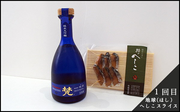 1回目/梵・地球(500ml)+鯖のへしこ(スライス)(冷蔵) 2回目/梵・ときしらず(720ml)+山うに豆(常温) 3回目/梵・日本の翼(720ml)+粒雲丹(冷蔵) ●梵・地球 氷温熟成されたお酒をブレンドした純米大吟醸酒。