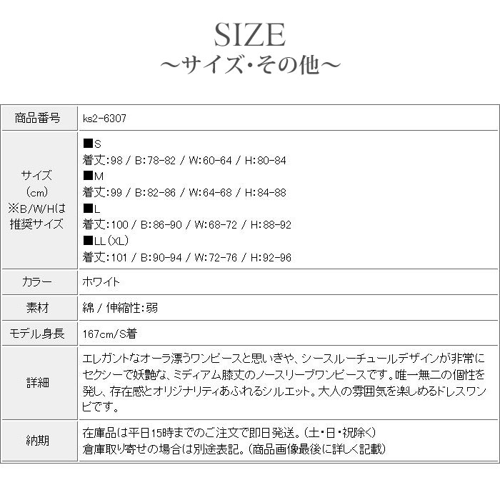 商品番号 ks2-6307 サイズ(cm)※B/W/Hは推奨サイズ ■S着丈:98 / B:78-82 / W:60-64 / H:80-84■M着丈:99 / B:82-86 / W:64-68 / H:84-88■L着丈:100 / B:86-90 / W:68-72 / H:88-92■LL(XL)着丈:101 / B:90-94 / W:72-76 / H:92-96 カラー ホワイト 素材 綿 / 伸縮性:弱 モデル身長 167cm/S着 詳細 エレガントなオーラ漂うワンピースと思いきや、シースルーチュールデザインが非常にセクシーで妖艶な、ミディアム膝丈のノースリーブワンピースです。