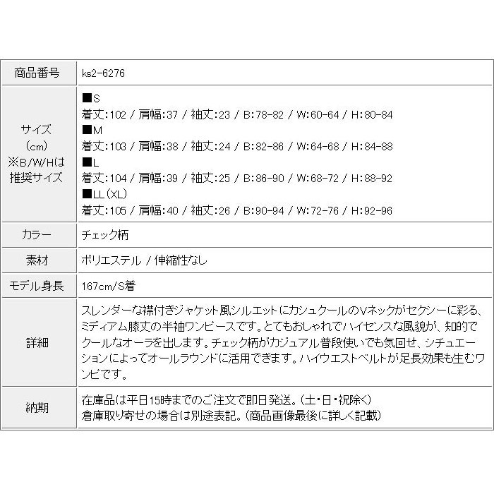 商品番号 ks2-6276 サイズ(cm)※B/W/Hは推奨サイズ ■S着丈:102 / 肩幅:37 / 袖丈:23 / B:78-82 / W:60-64 / H:80-84■M着丈:103 / 肩幅:38 / 袖丈:24 / B:82-86 / W:64-68 / H:84-88■L着丈:104 / 肩幅:39 / 袖丈:25 / B:86-90 / W:68-72 / H:88-92■LL(XL)着丈:105 / 肩幅:40 / 袖丈:26 / B:90-94 / W:72-76 / H:92-96 カラー チェック柄 素材 ポリエステル / 伸縮性なし モデル身長 167cm/S着 詳細 スレンダーな襟付きジャケット風シルエットにカシュクールのVネックがセクシーに彩る、ミディアム膝丈の半袖ワンピースです。